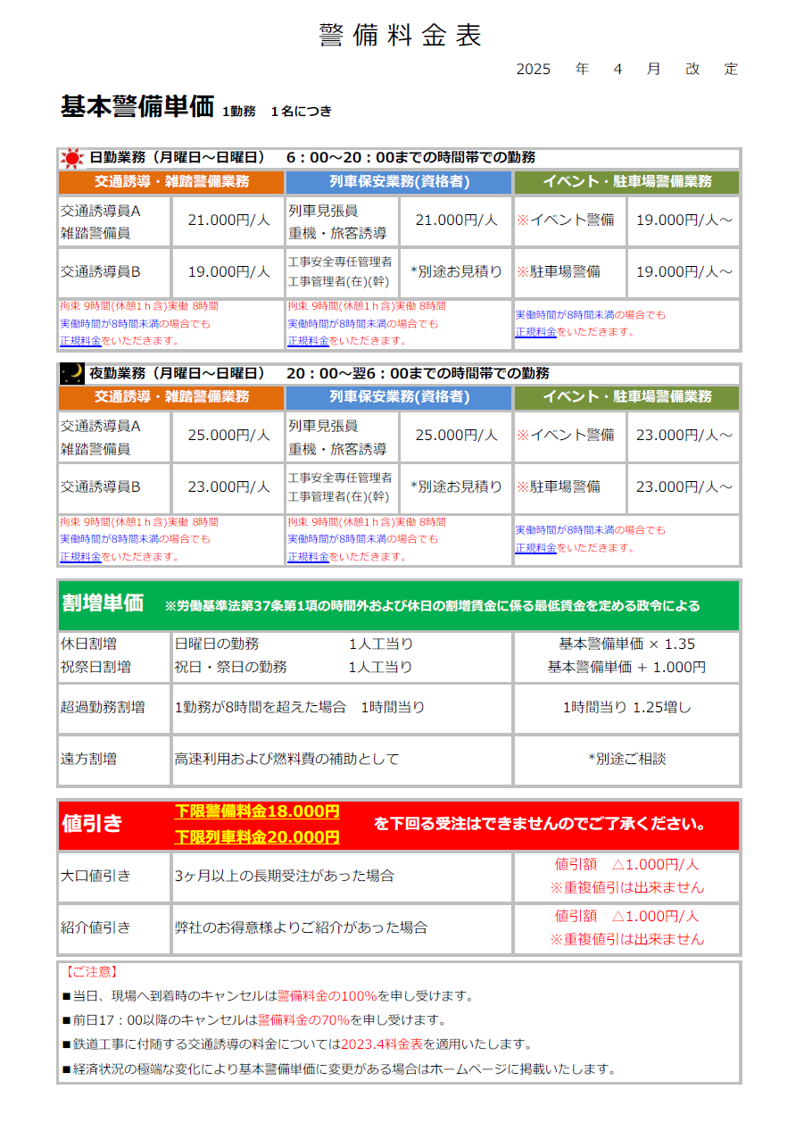 ※過去の警備料金表はコチラから 警備料金表(2014.10~)